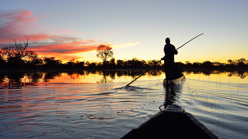 Med flyg till Okavangodeltat. Naturen är mycket vacker, med vattenvägar, periodvis översvämmade flodslätter, laguner, skogar och savann. I deltat finns ett rikt djur- och fågelliv. Safari gör ni med kunniga guider i öppna bilar, i kanoter och till fots – beroende på hur mycket/lite vatten det är i området. Övernattning i Okavangodeltat. Frukost, lunch och middag ingår.