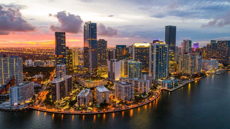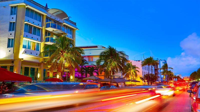 Miami är en internationell stad vid Floridas sydostspets. Dess kubanska inflytande återspeglas i kaféerna och cigarrbutikerna som ligger längs med Calle Ocho i Little Havana. På barriäröar över det turkosa vattnet i Biscayne Bay ligger Miami Beach, hem till South Beach. Denna glamorösa stadsdel är känt för sina färgglada art deco-byggnader, vita sand, hotell på surfside och trendiga nattklubbar.