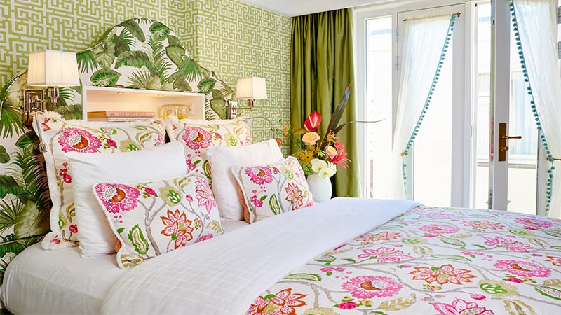 Alla rum är olika i storlek och färgval men med en romantisk och klassisk inredning med vackra tyger, tapeter och kristallkronor.